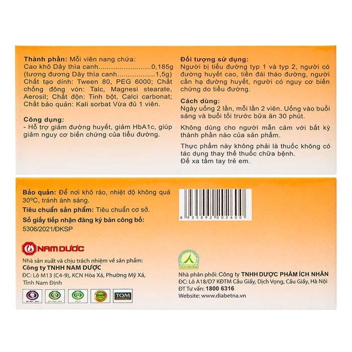 Diabetna với nguyên liệu chính là cao dây thìa canh sạch chuẩn quốc tế GACP cho người tiểu đường. Sản phẩm dùng được cho người có nồng độ đường huyết cao (tiền tiểu đường) và người bị tiểu đường type 1 và type 2.