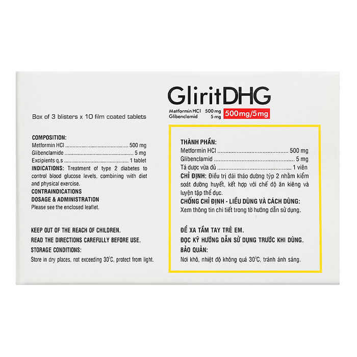 Thuốc điều trị tiểu đường GliritDHG 500mg/5mg có thành phần: